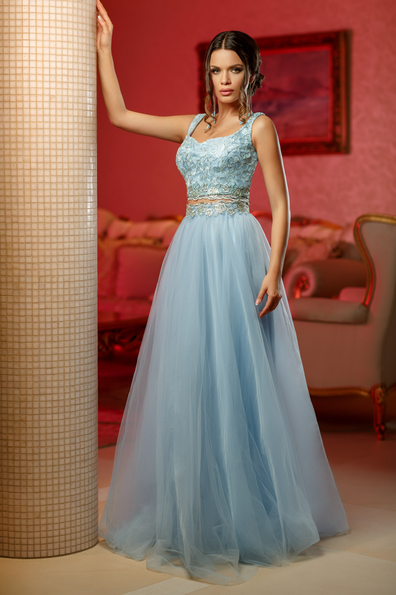 Set format din corset din dantela brodata cu fir auriu si fusta ampla din tull este elegant, potrivit pentru ocazii